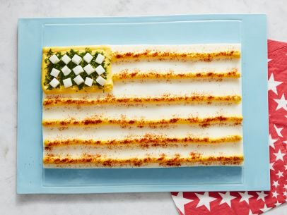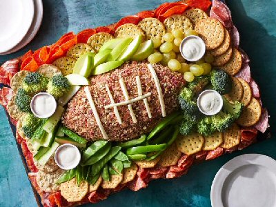 For the board: To assemble, fold the charcuterie in quarters and shingle them to make a standing rim around the edge of the board. Set 4 shot glass-size cups where goal posts would be in a stadium. Fill in the space around the cheese ball with the vegetables and fruit. Lay a row of each cracker just inside the charcuterie border to resemble little "seats" in your stadium. Pour ranch and blue cheese dressing into the shot cups for dipping.