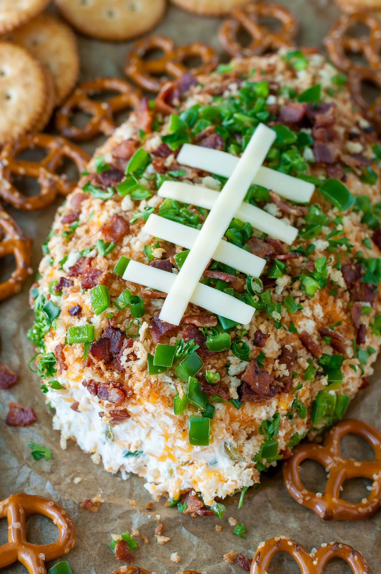 Form the cream cheese mixture into a football shape in the middle of a large serving board. Pat the pecan bacon mixture evenly over the tops and sides so it adheres. Brush away any excess. Pull the string cheese into pieces and cut to make the laces of the football. Chill the cheese ball until firm, about 2 hours.